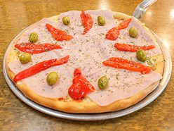 JAMON Y MOORON: salsa de tomate, mozzarella, jamon cocido, morrones en aceite, oregano y aceitunas verdes